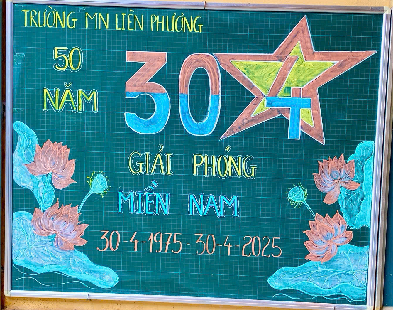 Trong không khí rộn ràng của những ngày cuối tháng Tư, các bé được cô giáo nhẹ nhàng kể chuyện, chia sẻ những thông tin đơn giản, dễ hiểu về ngày 30/4 – ngày đất nước được thống nhất, Bắc Nam sum họp một nhà. Cô giáo đã vẽ một bảng thông tin sinh động với hình ảnh và các biểu tượng của hòa bình, thể hiện niềm tự hào và tình yêu quê hương đất nước.